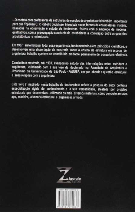 Este livro enseja uma viagem profícua no campo das estruturas, no qual as qualidades didáticas do autor são notórias. Em sete capítulos, descreve os fenômenos físicos, os sistemas estruturais básicos ligados aos materiais, a associação dos sistemas e struturais, os sistemas de suporte de vedação, os critérios práticos de lançamento de vigas e pilares. Os dois últimos capítulos abordam aspectos da natureza e as suas analogias com as edificações, terminando com um pouco de história das estruturas, com um tratamento agradável do tema. As ilustrações dos desenhos complementam de maneira primorosa a apresentação do trabalho. Este livro traz uma importante contribuição ao ensino das estruturas, não só para os alunos como também para profissionais que atuam na área das estruturas.