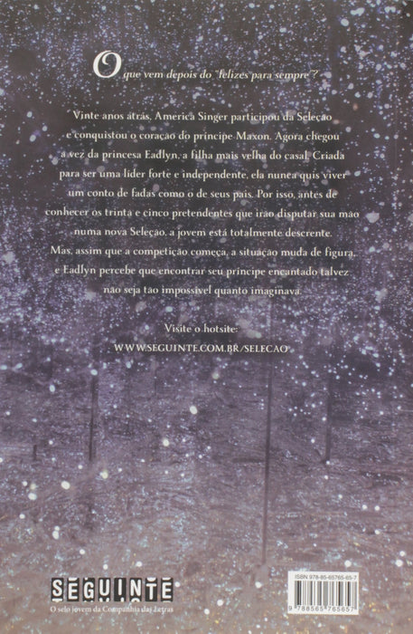 Vinte anos atrás, America Singer participou da Seleção e conquistou o coração do príncipe Maxon. Agora chegou a vez da princesa Eadlyn, filha do casal. Prestes a conhecer os trinta e cinco pretendentes que irão disputar sua mão numa nova Seleção, ela não tem esperanças de viver um conto de fadas como o de seus pais… Mas assim que a competição começa, ela percebe que encontrar seu príncipe encantado talvez não seja tão impossível quanto parecia.Detalhes do produto