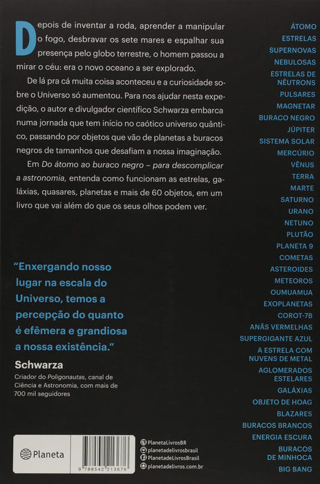 Criador do Poligonautas, canal de ciência no YouTube, com mais de 700 mil seguidores Depois de inventar a roda, aprender a manipular o fogo, desbravar os sete mares e espalhar sua presença pelo globo terrestre, o ser humano passou a mirar o céu: era o novo oceano a ser explorado. De lá pra cá muita coisa aconteceu e a curiosidade sobre o Universo só aumentou. Para nos ajudar nesta expedição, o autor e divulgador científico Schwarza embarca numa jornada que tem início no caótico universo quântico, passando por objetos que vão de planetas a buracos negros de tamanhos que desafiam a nossa imaginação. Em Do átomo ao buraco negro – para descomplicar a astronomia, entenda como funcionam as estrelas, galáxias, quasares, planetas e mais de 60 objetos astronômicos, em um livro que vai além do que os seus olhos podem ver. Detalhes do produto