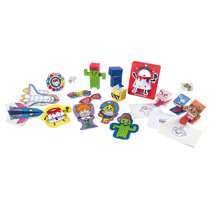 Contains: 1 3d pudding 3d comic, 4 burners, 2 glasses, 1 Spinner (two decorated discs + cardboard + string), 3 finger puppets, 3 animation flips, 3 paper toys, Character miniatures, 2 paper airplanes, 2 mini-brand pages, 1 origami - frog that jumps, 4 wax chalks and 1 instruction manual. < BR> Age: from 6 years to participants: 1 or more Estimated time game: 50 minutes