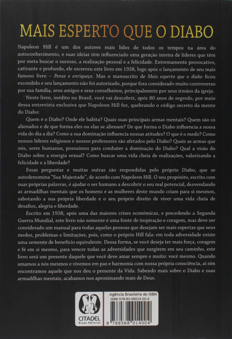 Neste livro, inédito no Brasil, você vai descobrir, após 75 anos de segredo, por meio dessa entrevista exclusiva que Napoleon Hill fez, quebrando o código secreto da mente do Diabo: Quem é o Diabo? Onde ele habita? Quais suas principais armas mentais? Quem são os alienados e de que forma eles ou elas se alienam? De que forma o Diabo influencia a nossa vida do dia a dia? Como a sua dominação influencia nossas atitudes? O que é o medo? Como nossos líderes religiosos e nossos professores são afetados pelo Diabo? Quais as armas que nós, seres humanos, possuímos para combater a dominação do Diabo? Qual a visão do Diabo sobre a energia sexual? Como buscar uma vida cheia de realizações, valorizando a felicidade e a liberdade? Essas perguntas e muitas outras são respondidas pelo próprio Diabo, que se autodenomina "Sua Majestade", de acordo com Napoleon Hill. O seu propósito, escrito com suas próprias palavras, é ajudar o ser humano a descobrir o seu real potencial, desvendando as armadilhas mentais que os homens e as mulheres deste mundo criam para si mesmos, sabotando a sua própria liberdade e o seu próprio direito de viver uma vida cheia de desafios, alegria e liberdade. Escrito em 1938, após uma das maiores crises econômicas, e precedendo a Segunda Guerra Mundial, este livro não somente é uma fonte de inspiração e coragem, mas deve ser considerado um manual para todas aquelas pessoas que desejam Detalhes do produto