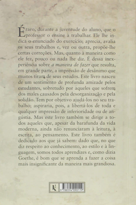 Este livro nasceu de um sentimento de profunda amizade pelos estudantes, sobretudo por aqueles que sofrem dos males causados pela desorganização e pela solidão. Tem por objetivo ajudá-los no seu trabalho e libertá-los de toda e qualquer impressão de inferioridade ou de angústia. A obra também se dirige a todos aqueles que, apesar da barafunda da vida moderna, ainda não renunciaram à leitura, à escrita, ao pensamento. Por fim, é dedicado também aos que já sabem: dado que, no que diz respeito ao conhecimento, ao estilo e à linguagem, somos todos aprendizes. Sobre o Autor: Jean Guitton (1902-1999) foi um filósofo católico de grande influência, autor de inúmeras obras. Apresentou sua tese doutoral o tempo e a eternidade em Plotino e Santo Agostinho em 1933 e, após iniciar sua carreira docente no liceu, foi chamado a lecionar na Universidade de Montpellier em 1937. Durante a II Guerra foi prisioneiro na Alemanha, em Elsterhorst. Tornou-se titular da cadeira de filosofia da Sorbonne em 1955, foi eleito para a Academia Francesa em 1961 e para a Academia de Ciências Morais e Políticas em 1987. Amigo de Paulo VI, participou como leigo do Concílio Vaticano II. Detalhes do produto